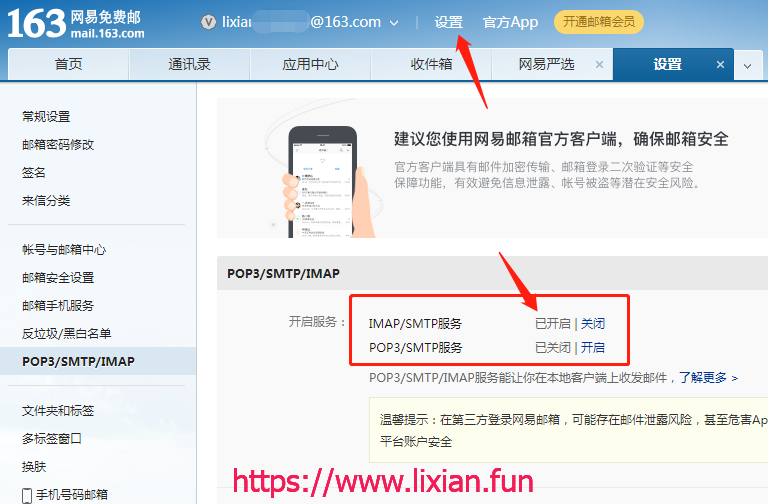 1.登录163邮箱网页版,在设置中点击POP3/SMTP/IMTP