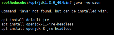 root@edusoho:/opt/jdk1.8.0_40/bin# java -version Command 'java' not found, but can be installed with: apt install default-jre apt install openjdk-11-jre-headless apt install openjdk-8-jre-headless